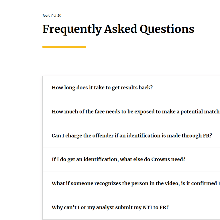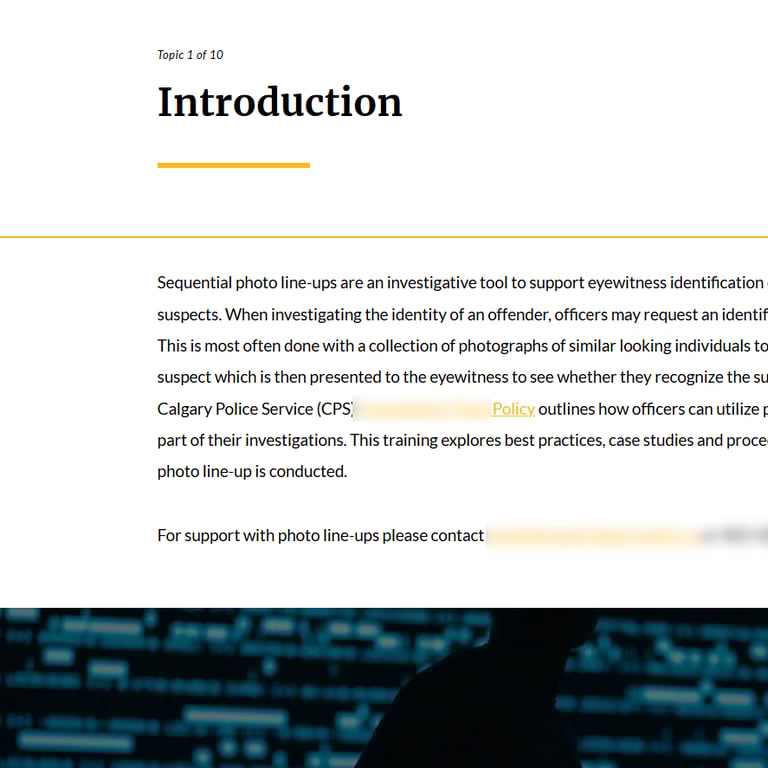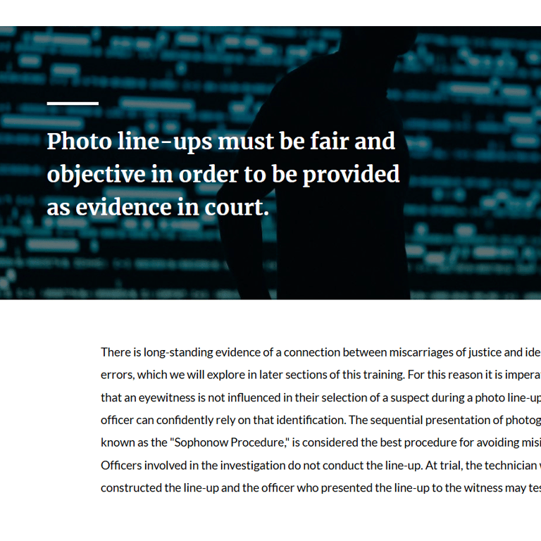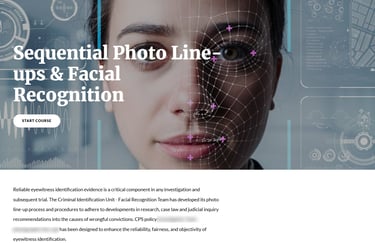 Development of an eLearning course comprised of two modules: Photo Line-Ups and Facial Recognition, for both a civilian and sworn employee audience within CPS. Course content is built upon best practices, recent and relevant case law, case studies, and CPS policy. Authoring tool: Articulate Rise.